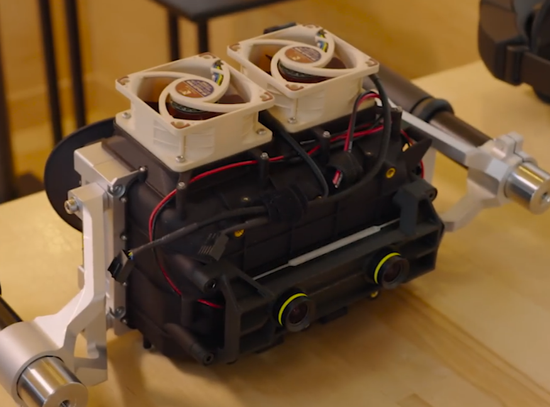 因为整个系统功率过高,团队成员甚至直接安装了两枚 袒露在外的散热风扇,来给硬件 设施散热;甚至因为系统过重, 根本没法用通例步骤戴在头上,所以不得不用两个把手扶着……