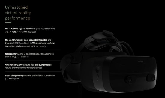 在 VR 头显领域,Meta 并不是唯一正在冲击视网膜分辩率的厂家 。高端头显品牌 Varjo 推出的 VR-3 型号头显已经超过了70ppd,甚至略微超过了行业认为的视网膜分辩率 标准,并且可视角度达到了115°,比 Quest 2 的 110°还要略微大丝毫 。
