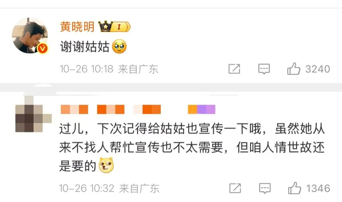 10月26日上午,黄晓明的老搭档刘亦菲也在社交账号发了两个“大拇指”, 支撑黄晓明新片:“就这个吴优@黄晓明 。”