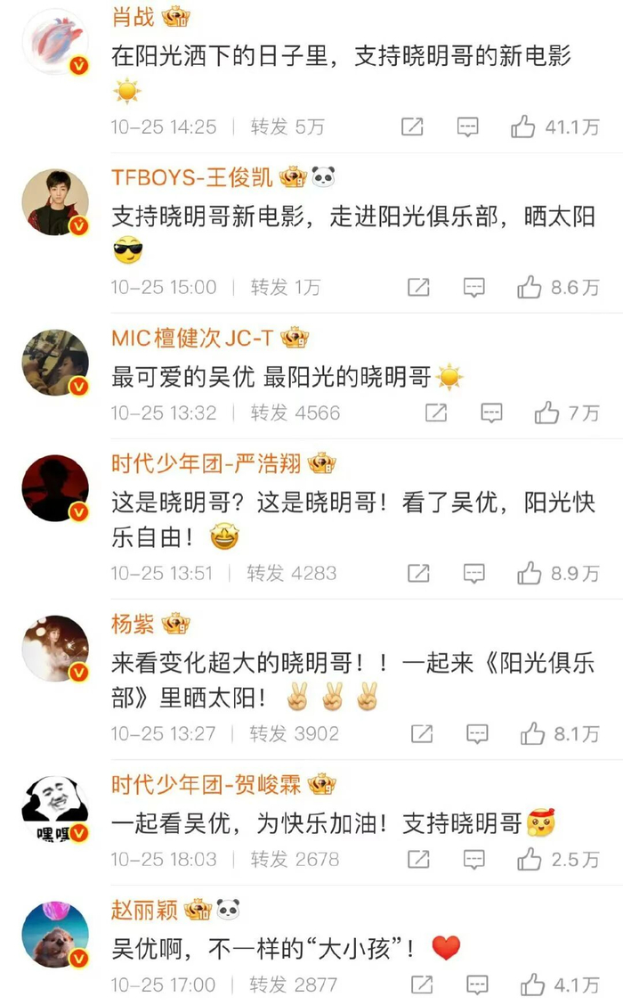10月25日, 驰名演员黄晓明的电影新作《阳光俱乐部》全国公映,他在社交账号发文邀请观众捧场,随后,肖战、赵丽颖、周冬雨、杨紫、王俊凯、檀健次、贾乃亮、陈赫、蒋欣、岳云鹏、张天爱等圈中好友都 踊跃为他打call,尽显黄晓明的好人缘 。