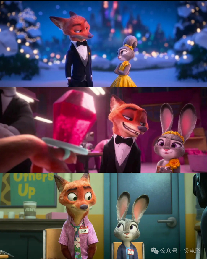 狐兔组合观点 固然有分歧,但尼克能搁置自己的观点不离不弃陪朱迪走下去,二人的互补 包容(第二部尼克 奉献的智慧没有第一部多,有损人物,所以得分没有第一部高),是最后将感情升华的必经之路 。