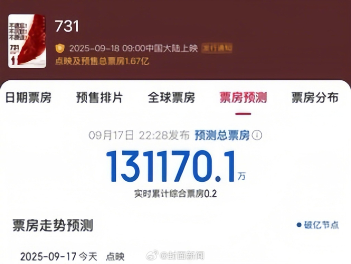 【#731票房狂飙是历史的回响#】# 铭记历史看731# 今天,电影《731》正式上映,首日便火力全开,上映1小时累计票房 打破 1.4 亿 。截至 9 月 18 日 11 时许,实时累计票房已达1.57 亿 。灯塔专业版 AI 预测其总票房13.66 亿,猫眼专业版则给出了13.11亿的动态票房预测 。