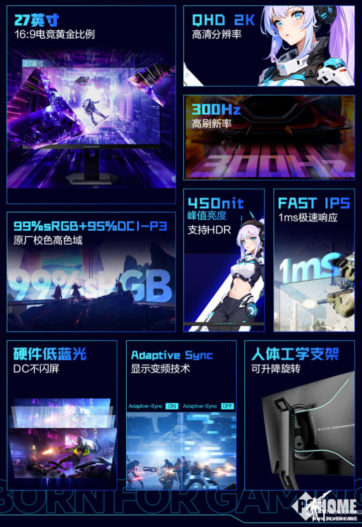 其采纳了27英寸Fast IPS面板,可视角度为178度(水 祥和垂直),分辩率为QHD/2K(2560 x 1440),原生刷新率为300Hz,响应 工夫(GtG)为1ms,对照度为1500:1,典型/HDR峰值亮度为400/450尼特,DCI-P3色域为,5%,sRGB色域为99%, 支撑HDR技术 。每台机器出厂都 通过了复杂严苛的校色,专业级 色彩 体现还原游戏世界本色 。该款显示器 支撑DC不闪屏技术,装备硬件低蓝光,有效过滤高能有害蓝光,让眼睛看得更 舒服 。同时还 支撑AdaptiveSync自适应同步技术, 肃清画面撕裂卡顿,游戏变得更流畅且更 巩固,让发烧友享受 圆满游戏体验 。
