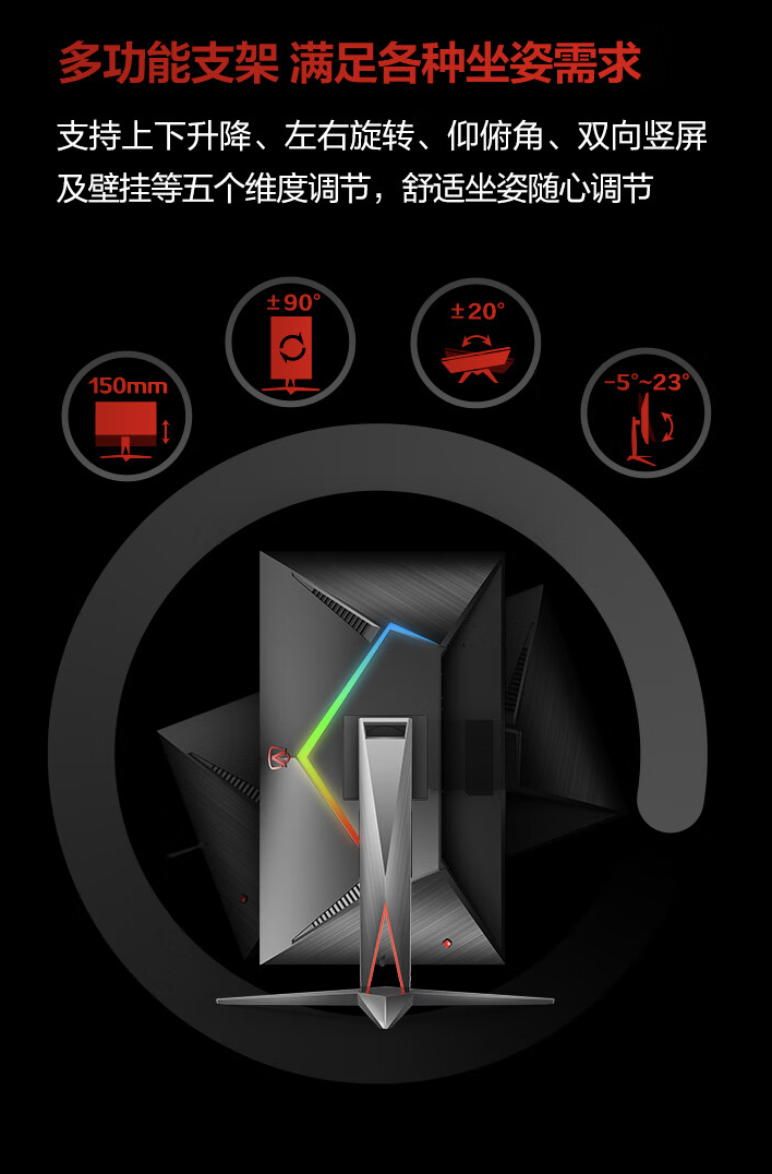 此外,这款显示器支架 支撑 歪斜 / 俯仰 / 横竖 / 升降,显示器本体 支撑?VESA 100x100mm?壁挂,提供 2?个 HDMI 2.1 接口、1 个 DP1.4 接口、1 个 3.5mm 音频接口 。