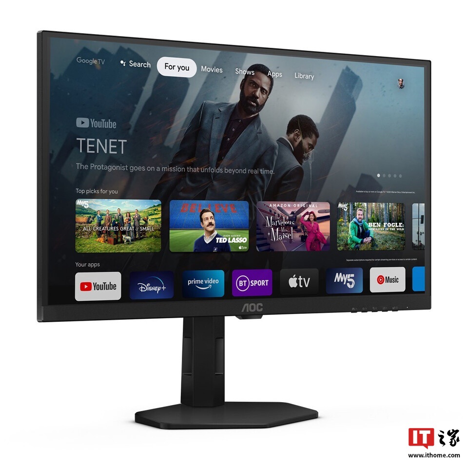 AOC?将这款显示器定位为“智能游戏显示器”,其内置?Google TV?系统,同时配有内置扬声器 。
