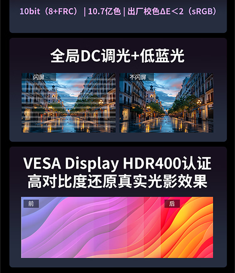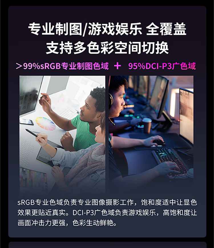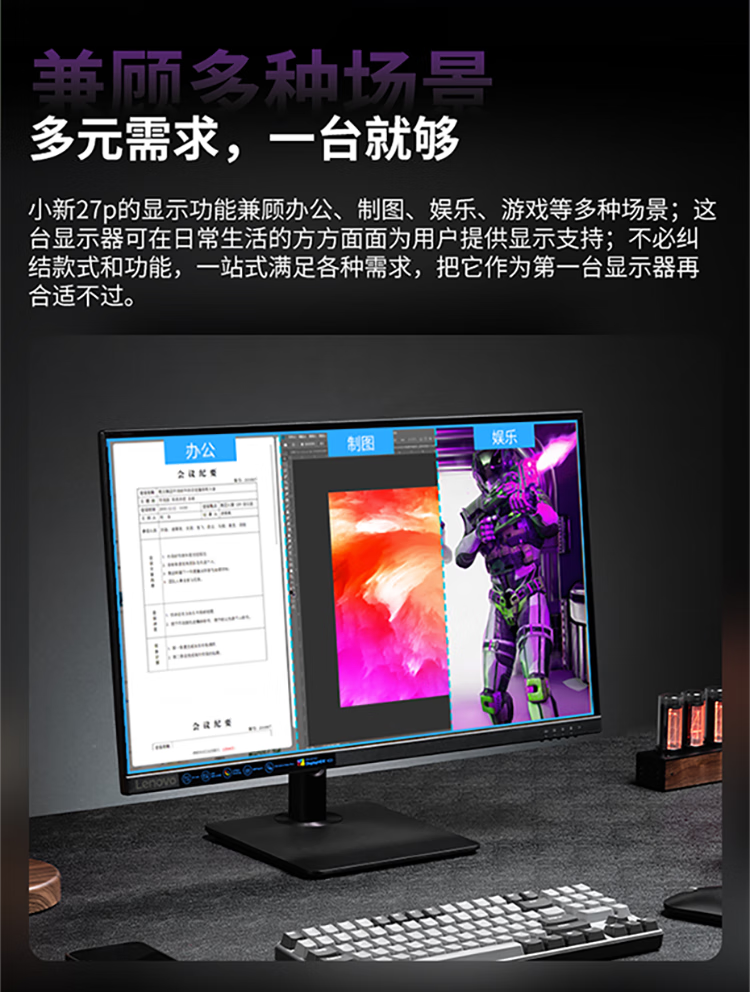小新 27p 显示器屏幕大小 27 英寸,分辩率为 4K(3840x2160),亮度 400nits,采纳三边窄边框设计,色域 遮蔽 99% sRGB 和 95% DCI-P3,出厂校色 ΔE<2(sRGB),全局 DC 调光 + 低蓝光 。