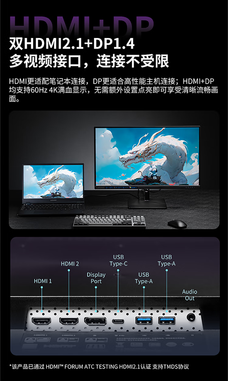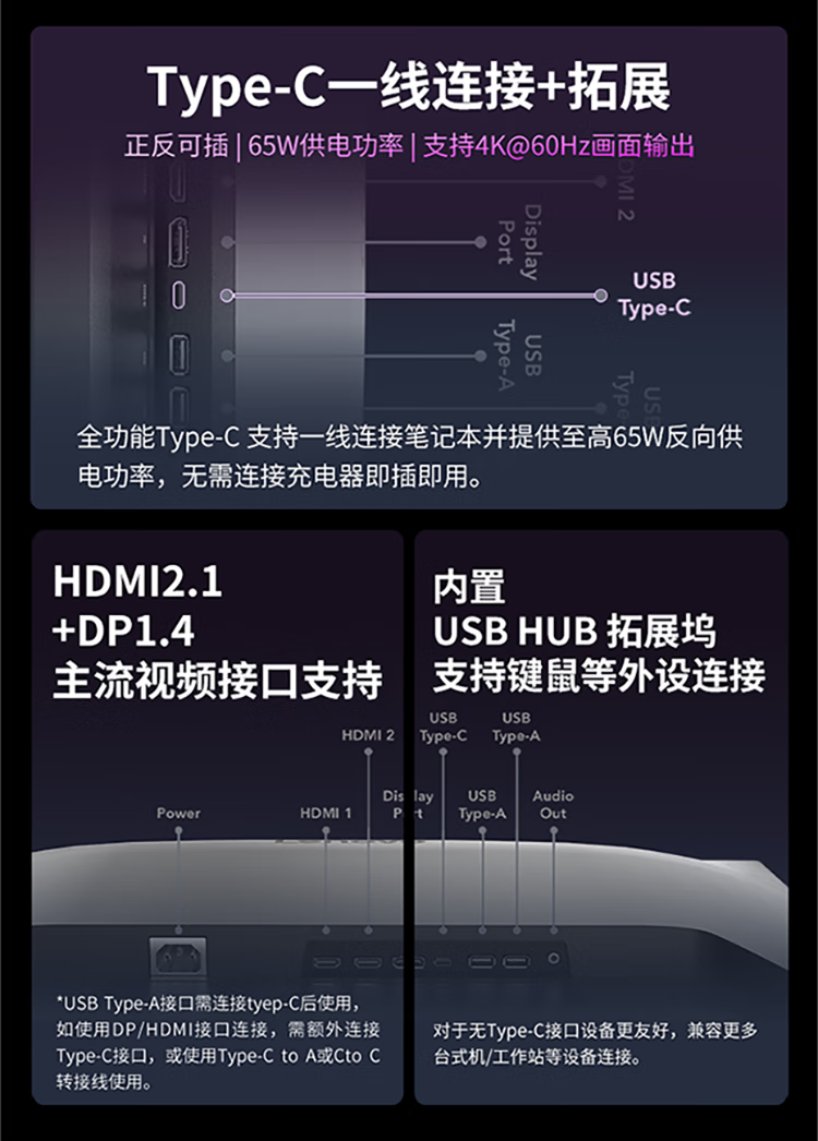 小新 27p 显示器 支撑 Type-C 一线连 + 拓展, 支撑最高 65W 反向供电,有 2 个 HDMI 2.1 TMDS 接口、1 个 DP 1.4 接口、1 个 USB-C 接口、2 个 USB-A 接口和一个 3.5mm 音频接口 。