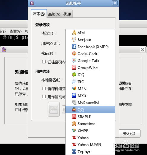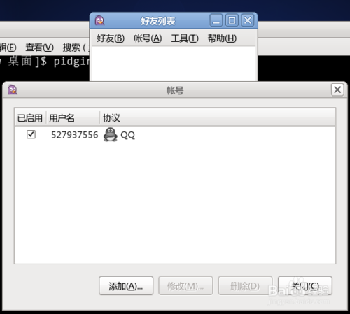 2、进入终端,键入命令 pidgin,回车 。在这儿说明一下,一些常用的 linux 操作系统安装完成后都自动安装了这个软件 。如果提示没有安装,可以先进行安装 。 3、第一次启动该软件,会出现一个添加帐号向导,点击“添加” 。 4、在“添加帐号”窗口中,点击协议选择框 。 5、在展开的选项中,我们选择其中的一个 。例如,以QQ为例 。 6、接下来,输入QQ帐号和密码,然后点击“添加”按钮 。 7、这时,QQ帐号便添加成功了 。 8、我们关闭“添加”窗口,便可以登陆QQ了 。 注意: 由于 linux 版的 QQ 最新版为 2008,目前已被官方禁止使用 。如果想在 linux 中聊天,建议选择添加其他帐号 。谢谢阅读,希望能帮到大家,请继续关注脚本之家,我们会努力分享更多优秀的文章 。 |
