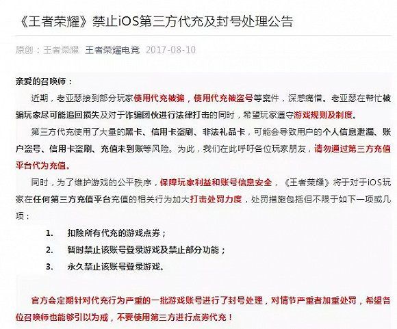 既不能放弃苹果这一“金大腿”, 又必须接受这一“金大腿”的不作为, 游戏厂商的处境不可谓不尴尬。 游戏厂商们只能自己想办法, 尽量减少因游戏代充造成的损失。 事实上, 有越来越多的厂商已经发布了公告, 严厉打击iOS代充行为。