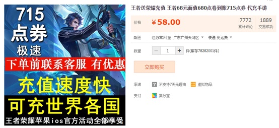 苹果手游代充, 一直都是游戏厂商心头痛。 在淘宝网随便一搜, 就能搜到许多专为App Store中的手机游戏充值的店铺。 这种店铺之所以能够吸引客户, 就是因为两个字:便宜!例如, 人民币与王者荣耀点券的兑换比例固定为1:10, 即68元人民币只能购买680点券, 而代充店铺则可以做到58元购买715点券, 省了13.5元, 对于广大并不富裕的玩家而言, 这无疑是极具吸引力了。