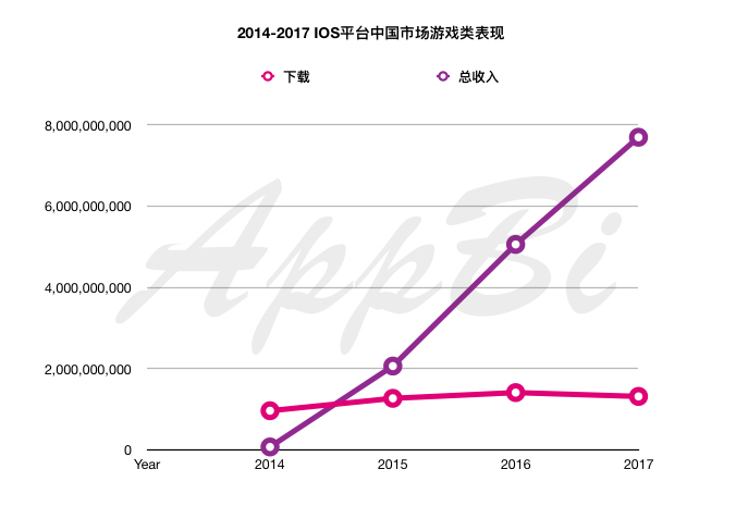自2014年以来, 中国游戏市场呈现了“井喷式”增长。 专注苹果搜索广告和App Store数据优化的AppBi爱比数据显示, 2014–2017年iOS平台中, 中国游戏总下载量虽然没有太大的浮动, 收入却翻了近4倍。 2018年Q1, 游戏类收入达2,355,702,053.53美元, 几乎一个季度就达到了2014年全年的收入。