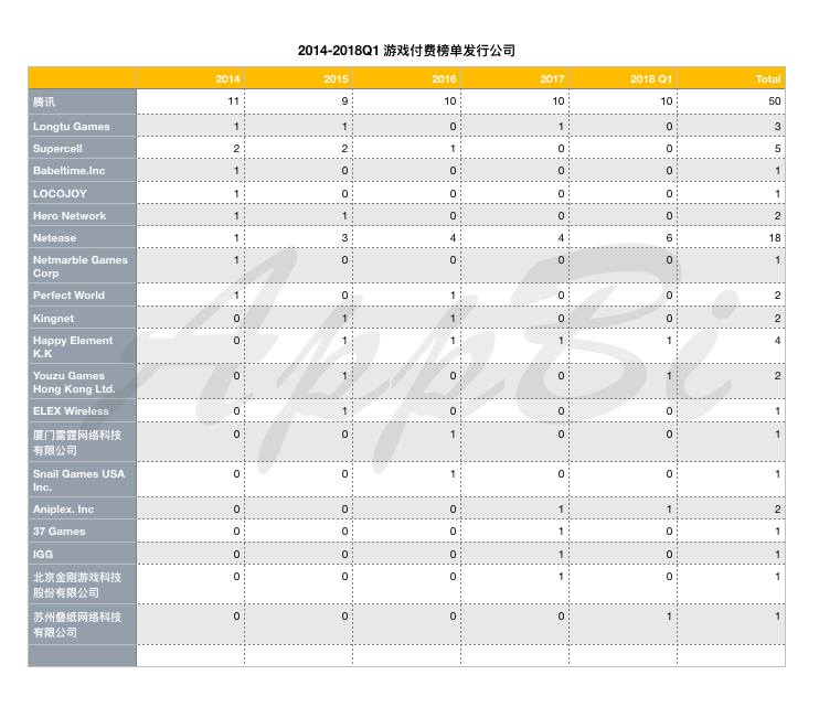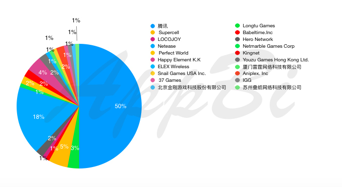 所有游戏发行公司中, 腾讯几乎已绝对性优势占领了top 20付费榜单。 2014–2018 Q1付费榜单中, 腾讯发行的游戏占比50%, 第二名网易占 18%, 其余游戏公司占比均为个位数。 腾讯和网易在游戏市场中占据了不可撼动的 “霸主地位”, 近几年, 虽然爱奇艺等公司也大力加强了游戏开发, 但是仍与腾讯、网易等第一梯队有所差距。