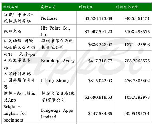 2018年Q1, 由网易发行的游戏《决战!平安京-式神集合召唤》成为利润增长最快的游戏。 在高增长的游戏榜单中, 2018年Q1 相较往年腾讯、网易两分天下的情况更为多元化。 一些创业型游戏公司均在榜单中有不错的表现。