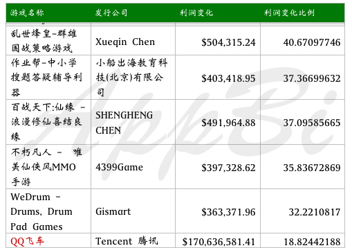 腾讯发行的游戏中, 表现最为出色的是《QQ飞车》, 利润总增长约1.7亿美元, 增长幅度约19%。 目前, 《QQ飞车》的热度增长已超越《王者荣耀》, 但是, 《王者荣耀》仍有较大的用户基数。 短期内, 《王者荣耀》在iOS游戏榜单中仍是不可撼动的“霸主”。