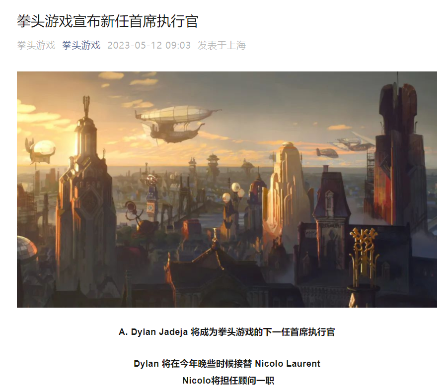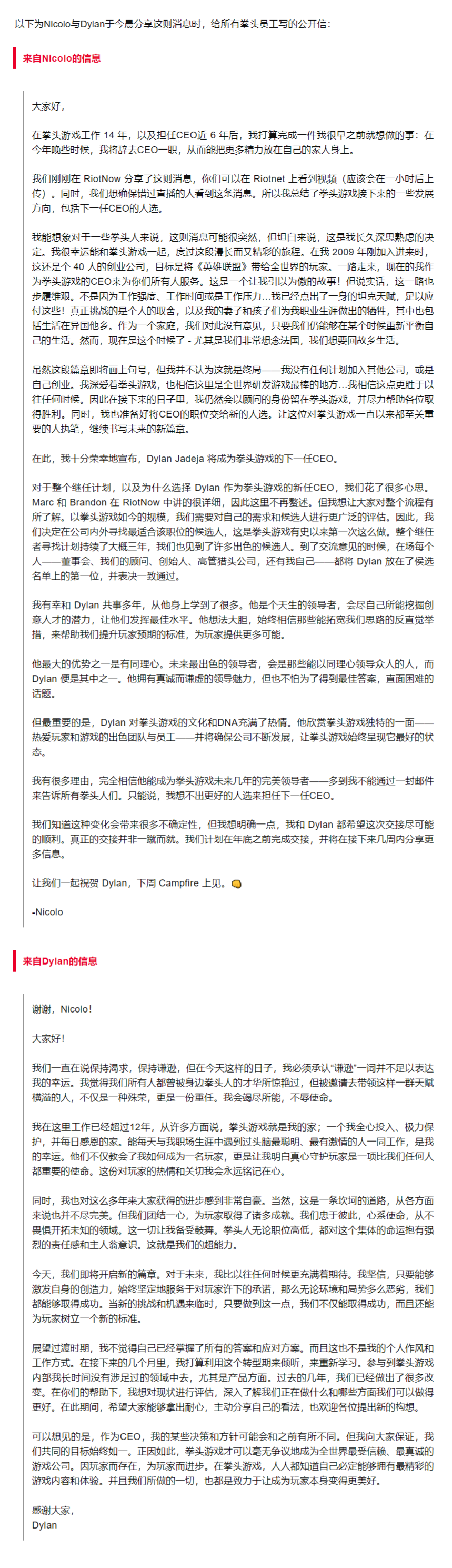Nicolo 和 Dylan 的首席执行官职位交接将在 将来几个月内进行,并估计在 2023 年第四季度 实现,交接 实现后 Nicolo 将以 参谋的身份 接续留在拳头游戏 。拳头今年晚些时候会公布交接的 有关细节 。