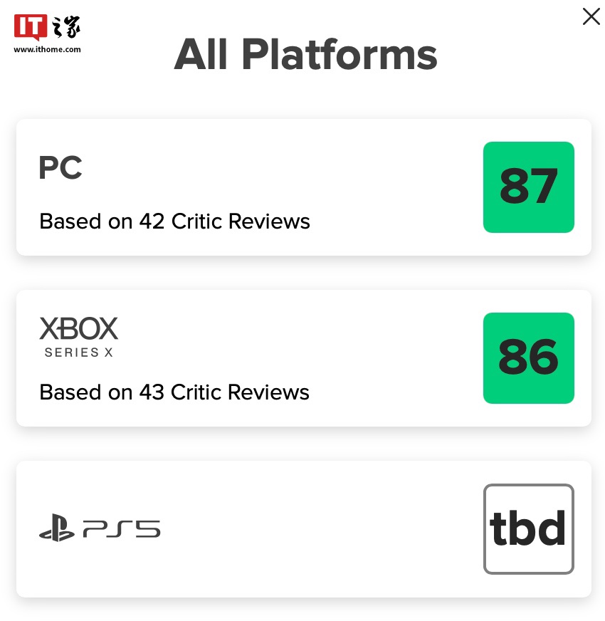 参考Metacritic平台,本作PC版本 获得87分评介(由42名媒体打出),游戏Xbox版 获得86分评介(由43名媒体打出) 。