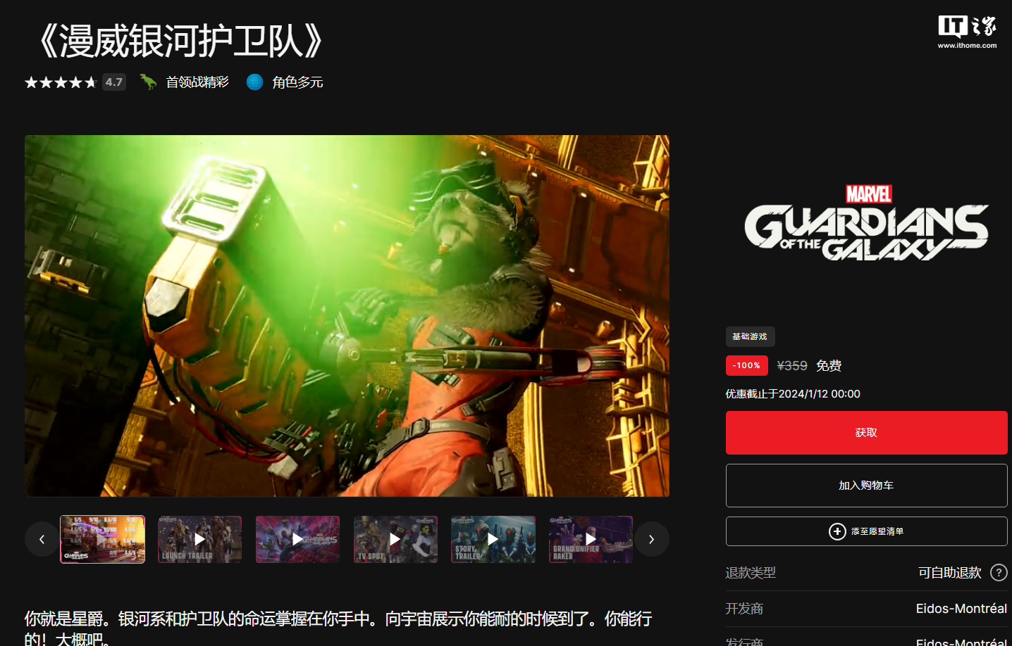 1 月 4 日 信息,Epic 游戏商店正在进行“连送模式”,最终一款游戏现已揭晓 ——《漫威银河护卫队》,原价 359 元, 支撑中文,截至 1 月 12 日 。