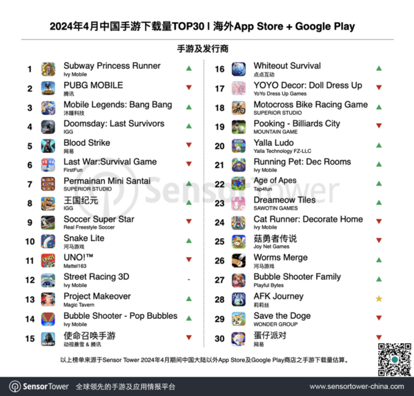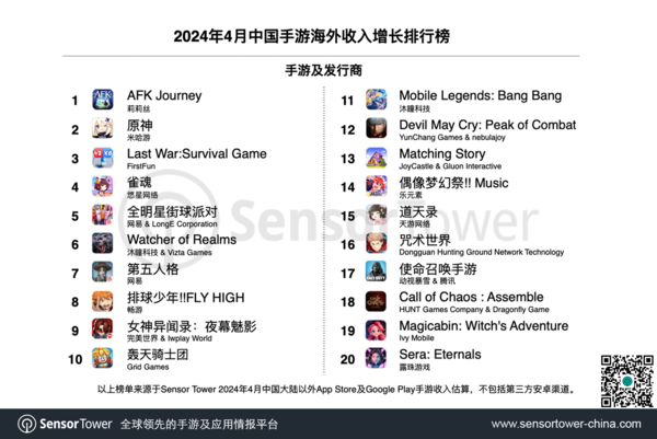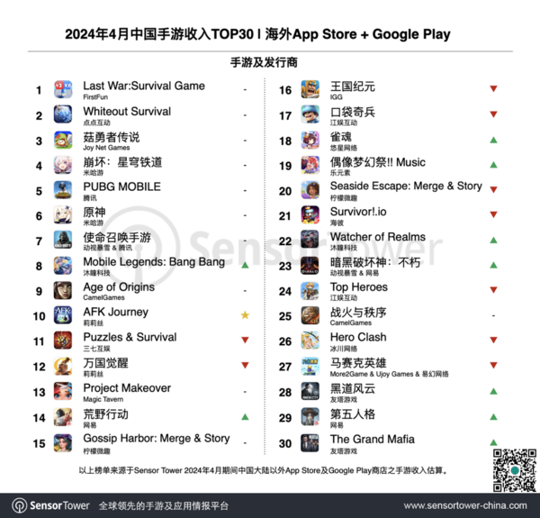Sensor Tower商店情报平台最新数据显示,2024年4月中国手游出海产品中,《Last War》蝉联收入榜首,《AFK Journey》登顶增进榜 。