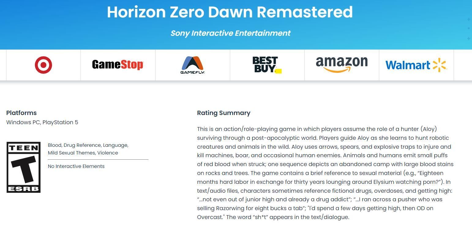 附上 ESRB 页面截图如下, 能够看到《地平线:零之曙光》复刻版的 有关 形容,和 2017 年在 PlayStation 4 主机上发行的《地平线:零之曙光》 彻底 统一 。