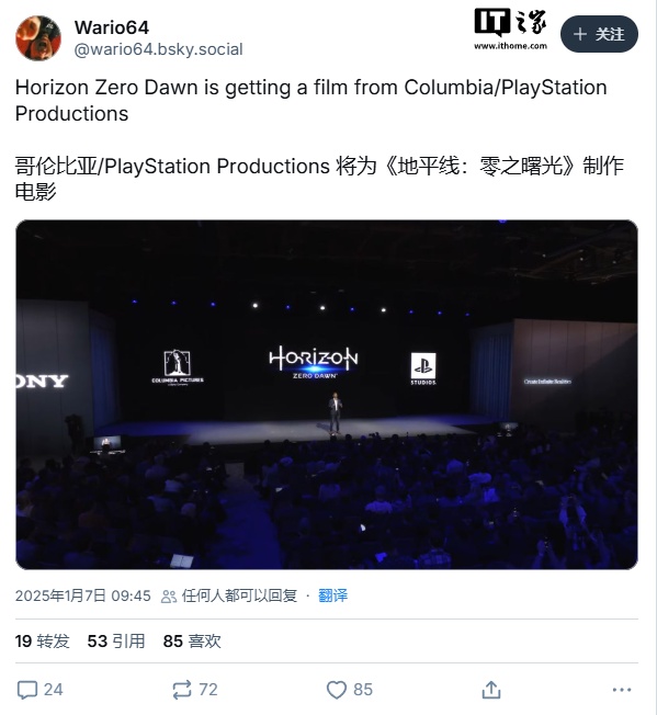 1 月 7 日 信息,索尼在 CES 新闻公布会上 宣告将《绝地潜兵》《地平线:零之曙光》改编成电影,其中《零之曙光》由哥伦比亚影业和 PlayStation Productions 联合制作 。