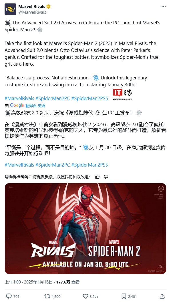 1 月 16 日 信息,《漫威争锋》官方账号在 X 平台公布推文, 宣告为 庆祝 PC 版《漫威蜘蛛侠 2》游戏于 1 月 30 日发行,将同步推出高级战衣 2.0 。