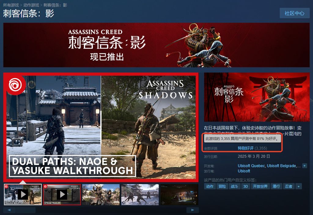 查问 Steam 页面,《刺客信条:影》游戏目前评论数为 3355 条,好评率为 81%,综合评介为“特殊好评” 。