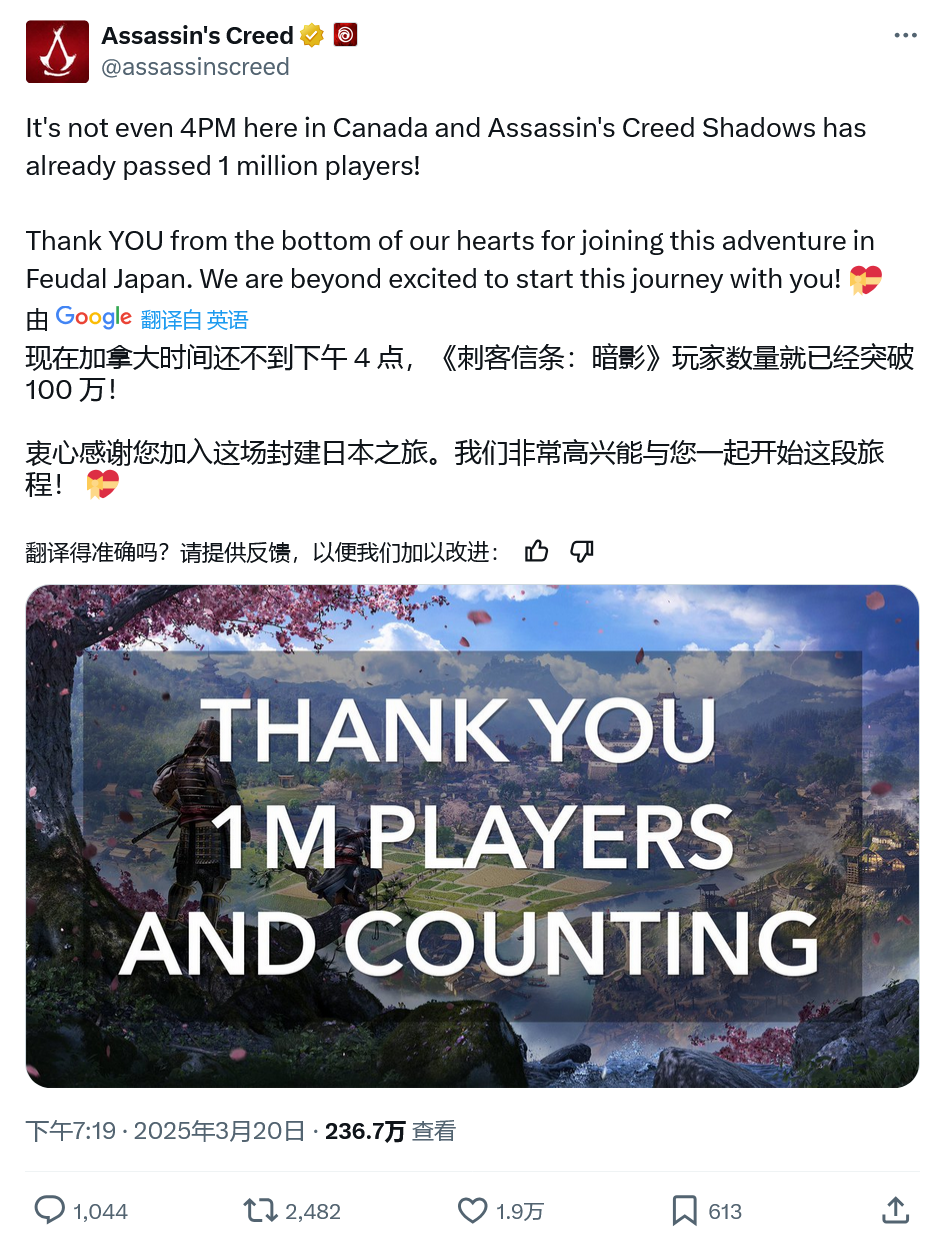 3 月 21 日 信息,育碧昨日(3 月 20 日)在 X 平台公布推文, 宣告《刺客信条:影》游戏发行首日,达成百万发烧友里程碑 。
