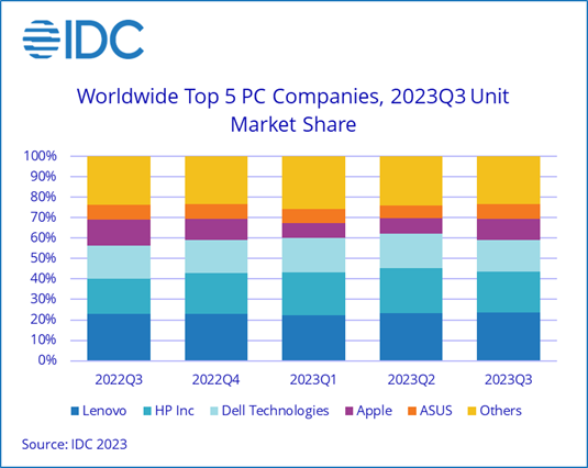 2023Q3 全球 PC 市场战报:联想第一、惠普唯一正增长 6.4%、苹果跌幅最大 |