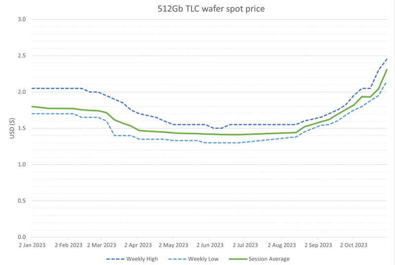 IT之家在此附上?DRAMeXchange 图表数据,近几个月来,用于生产容量为 64 GB 的 512 千兆位 TLC 闪存芯片的硅晶圆现货价格上涨 。当前的价格为每颗芯片 2,304 美元,比 6 月份高出 63.3%,当时此类芯片的价格为 1,411 美元 。上周,此类芯片的现货价格上涨了 12.7% 。 因而,1TB TLC 闪存的成本从大概 22 美元添加到 36 美元 。