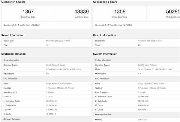 GeekBench数据库里浮现了至强铂金8558P、至强铂金8551C,均为48核心96线程,然而缓存容量 鉴别有误,三级缓存应该有260MB而不是16MB 。