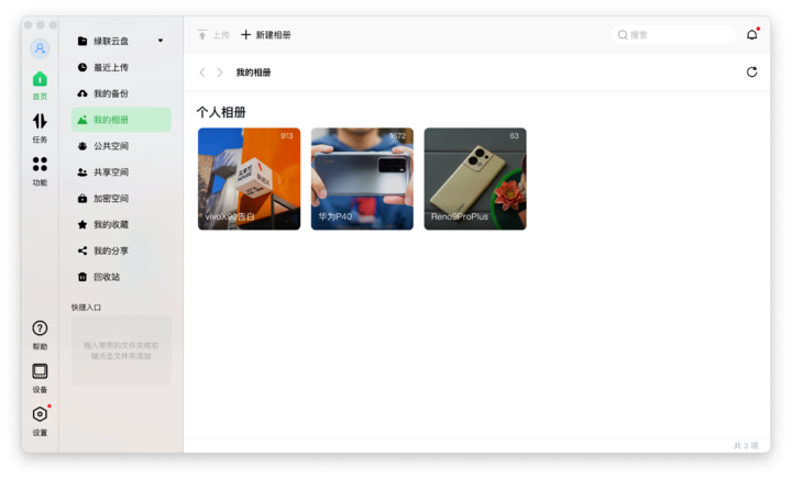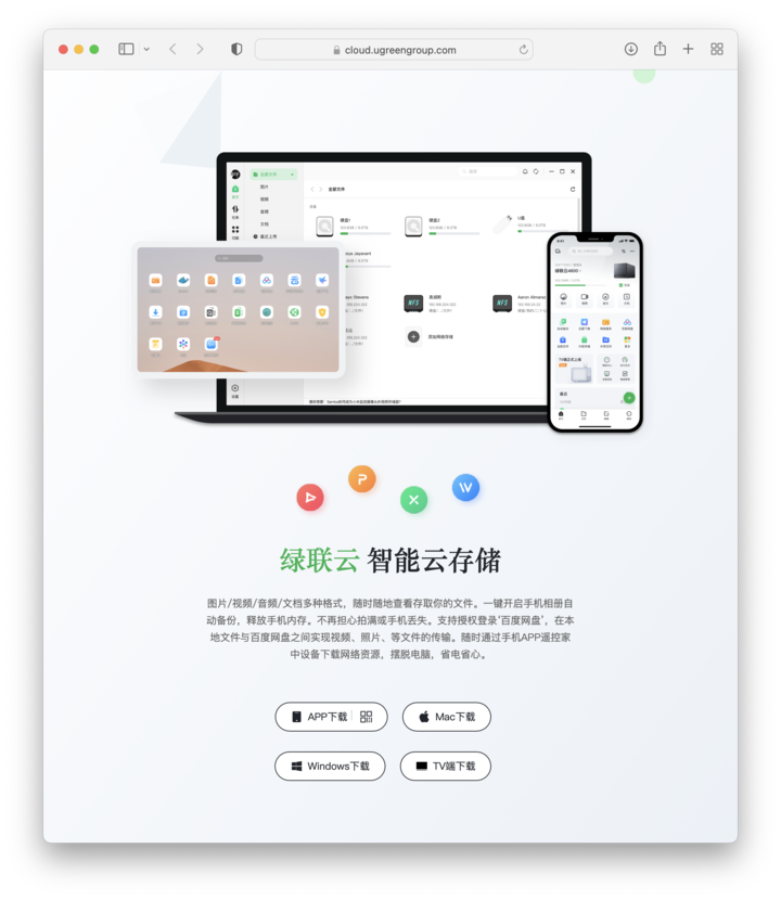 绿联云在软件端的布局十分 丰盛, 根本上 遮蔽了我们常用的多个主流平台,提供了 Windows 和 macOS 的电脑版客户端;在移动端 部分,则提供了 iOS/iPadOS、Android、Android TV、微信小程序的版本 。