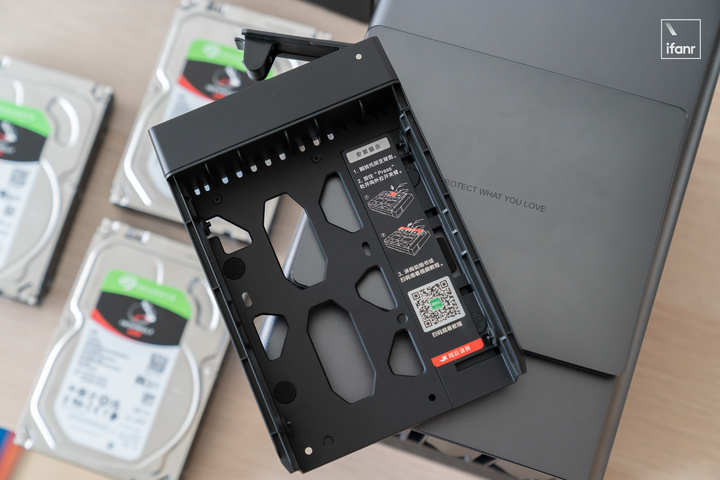 考量到易用性,绿联在硬盘支架和磁吸机盖上都贴了 揭示标识,除了图例之外,扫二维码也 能够跳转去看视频教程,这点关于新手来说 比较 友爱 。