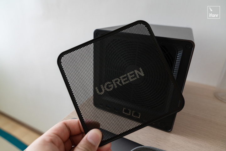 机身 反面有着一把散热风扇,绿联在其表面也 搁置了一个磁吸式的防尘滤网,需求清洁的时候 能够 顺手取下 。
