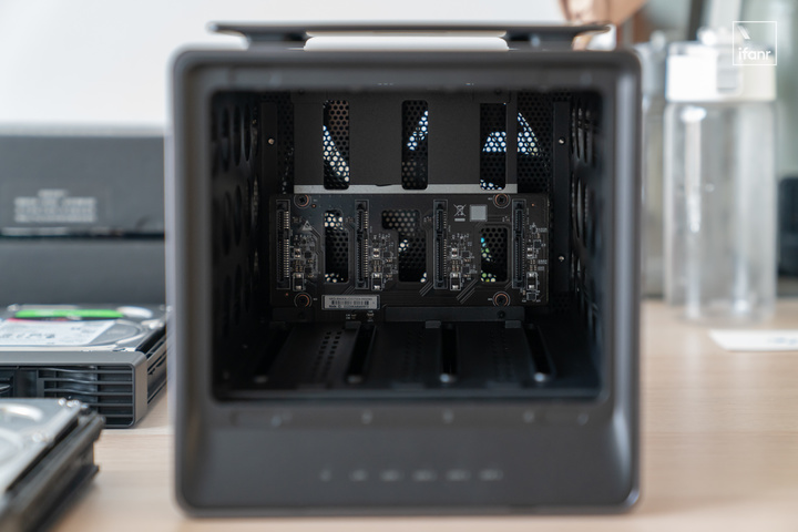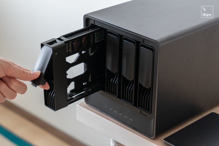 值得一提的是,绿联的这个四盘位插槽做工特殊好,拉取都十分顺滑, 详尽程度在同类产品里都算得上出色,丝毫都不像是刚开始造 NAS 的样子 。
