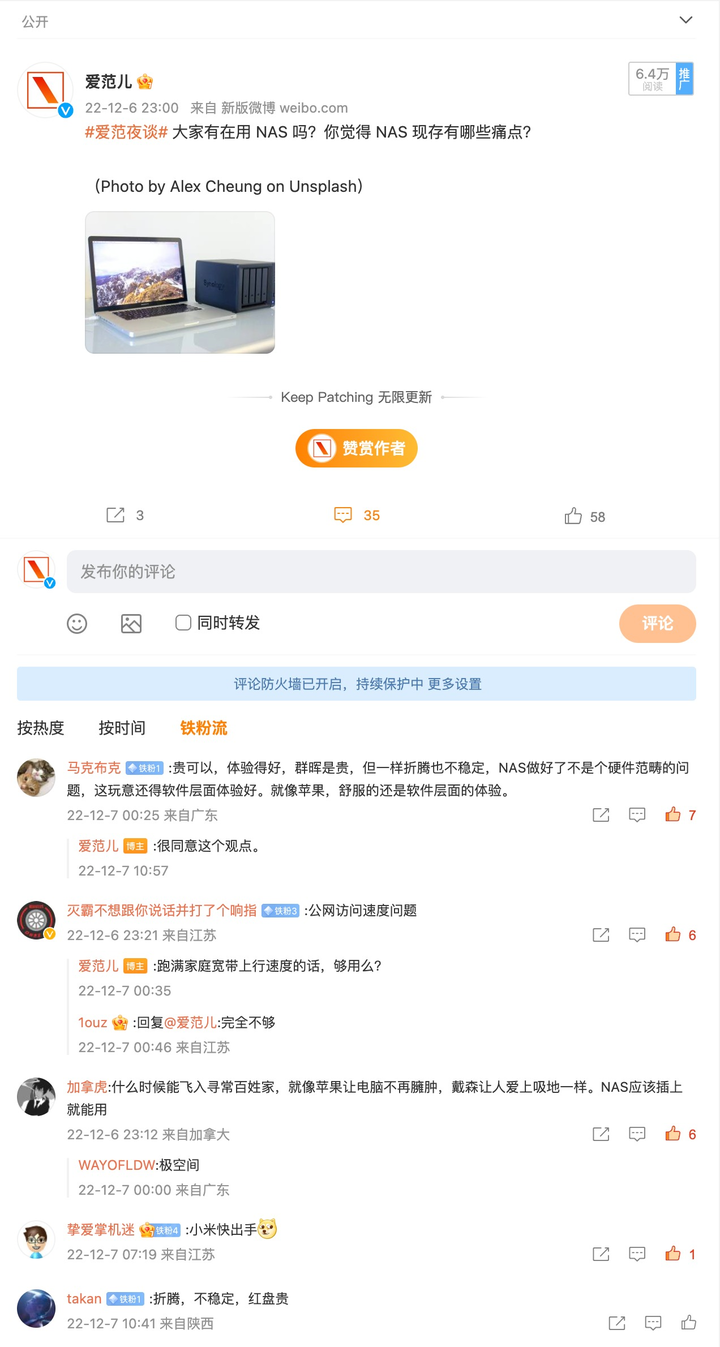 稍早前,爱范儿在微博上也 发动了一次环绕 NAS 痛点的话题 探讨,有众多读者都在评论区留言指出了他们对 NAS 的一些印象,以及现存的多方面痛点 。