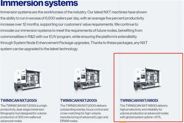 ASML公司官网信息显示,该公司主流的DUV光刻机产品共有三款 设施:TWINSCAN NXT:1980Di,TWINSCAN NXT:2000i和TWINSCAN NXT:2050i,其中2000i和2050i两款是公司在申明所指的产品 。