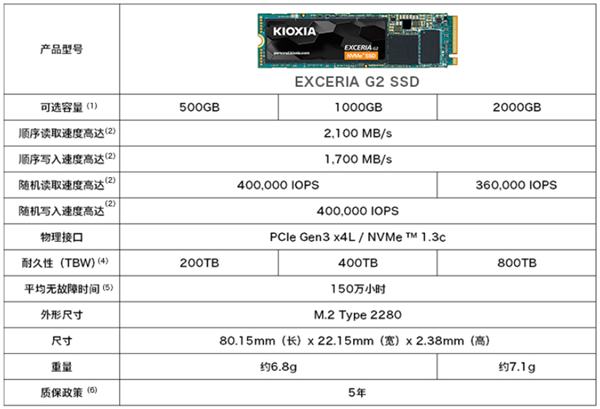 RC20基于铠侠96层堆栈的TLC闪存,PCIe 3.0 x4通道,读取速度2100MB/s,写入速度1700MB/s,随机读取40K IOPS,随机写入40K IOPS,400TBW寿命(2TB为800TBW),MTTF 无端障 间隔150万小时,功耗3.5W,质保5年 。