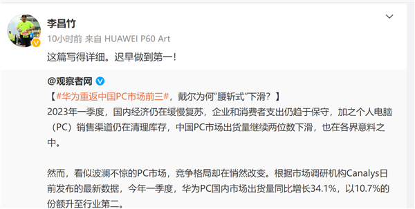 6月1日 信息,关于华为重返中国PC市场前三这件事,该公司用户BG 策略Marketing部副总裁李昌竹 示意,迟早做到第一 。