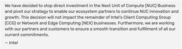 7月12日 信息,目前Intel在一封邮件中确认,不再 接续投资NUC业务线,也不会再设计、创造任何NUC产品 。