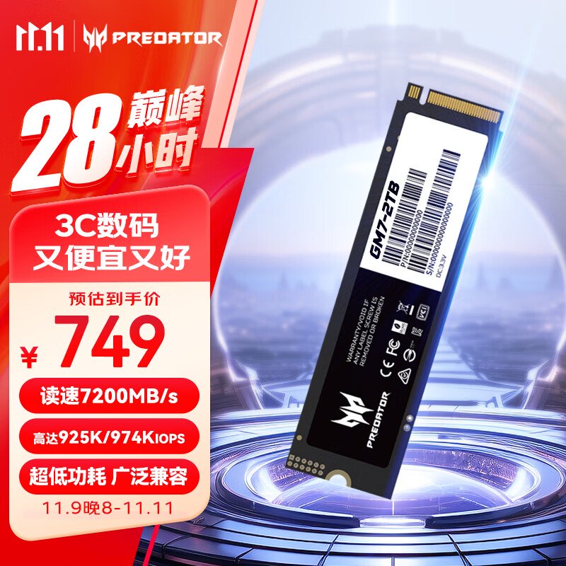 宏碁掠夺者 2TB 固态硬盘 GM7 系列,读速 7200 MB/s,最近日常报价为 749 元 。