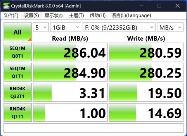 而在CrystalDiskMark测试中,希捷银河ExosX24的顺序读取速度为286.04MB/s,顺序写入速度则为280.59MB/s,在机械硬盘中属于佼佼者 。
