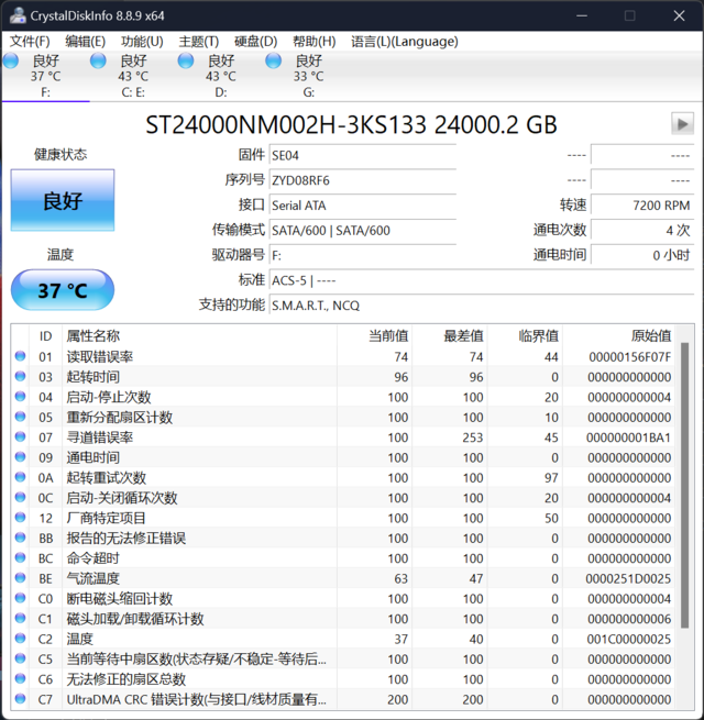 通过CrystalDiskInfo查看希捷银河Exos X24的 根本信息, 能够看到其标称容量为24000GB,型号为ST24000NM002H,最高 支撑SATA 6Gbps传输模式, 支撑S.M.A.R.T.、NCQ 性能 。