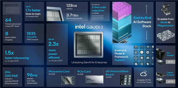 Gaudi 3 AI加快器采纳台积电5nm工艺,装备8个矩阵引擎、64个张量核心、96MB SRAM缓存、1024-bit 128GB HBM2E内存(带宽3.7TB/s),还有16个PCIe 5.0通道、24个2000GbE网络、JPEG/VP9/H.264/H.265解码器 。