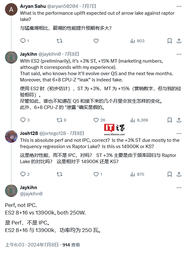 7 月 9 日 信息,科技媒体 WccFtech 昨日(7 月 8 日)公布博文,曝料英特尔 Arrow Lake-S 工程样品的基准测试 成就,在 250W 功率下相比 Raptor Lake CPU,单核性能 晋升 3%,多核性能 晋升 15% 。