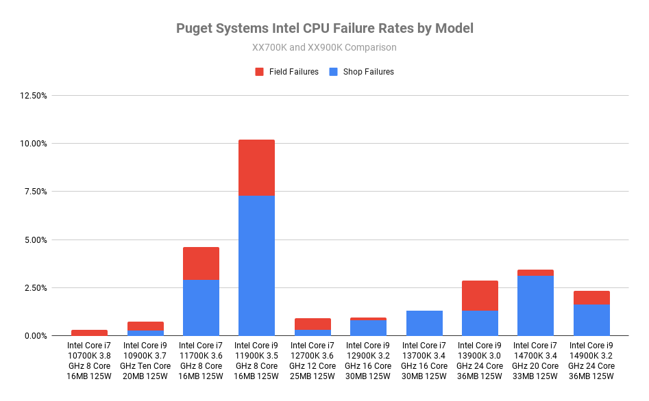 该公司还提供了进一步的细分数据,表明故障是 产生在其工厂还是在消费者端,并 示意自第 11 代 解决器以来,他们尚未在消费者端看到如此高的故障率 。Puget Systems 总裁 Jon Bach 示意:“全部这些故障都是在 6 个月后 产生的,这 象征着我们估计 将来甚至在 Intel 公布微码补丁后,故障率仍将 维持较高水平 。”该公司指出,这些消费者端故障每月约为 5 到 7 个,难以归类为“重大问题” 。