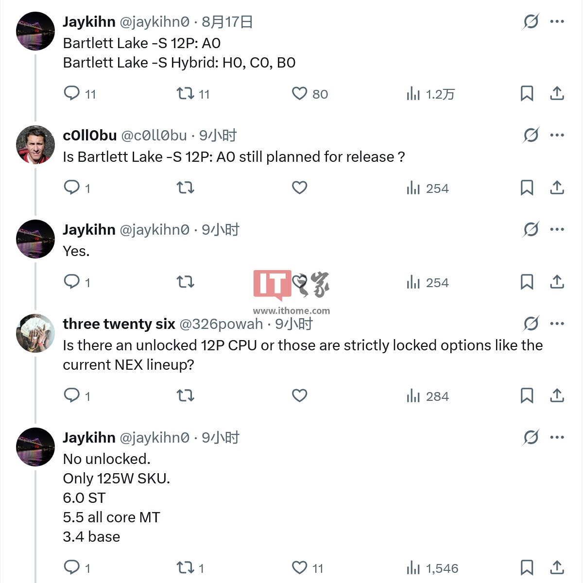 @jaykihn0 示意英特尔仍 方案推出基于 A0 步进 Die 的 "Bartlett Lake S 12P",而该系列旗舰 12 核心型号的参数将是锁频、仅 125W 标定功耗、单核睿频 6.0GHz、全核睿频 5.5GHz、基准频率 3.4GHz 。