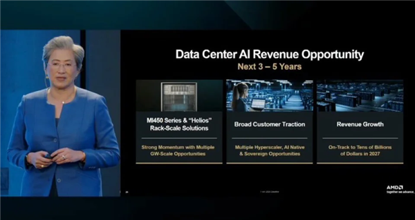 她估计, 将来三到五年,AMD的年均营收复合增进率(CAGR)将超过35%,其中AI数据 核心营收 均匀增进将高达80% 。