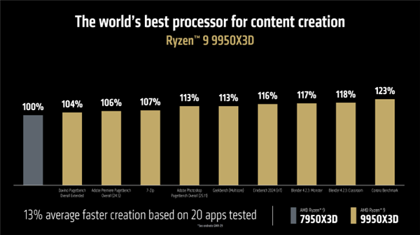 AMD官方实测性能显示,锐龙9950X3D与锐龙9 7950X3D相比,40款游戏 均匀帧率 遍及了8%,最高 晋升58% 。20款生产力软件 均匀性能 晋升13%,最高 晋升23% 。