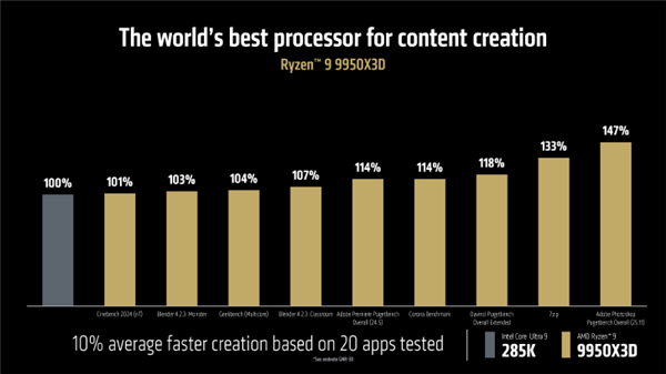 对照Intel酷睿Ultra 9? 285K,锐龙9950X3D 40款游戏 均匀帧率 晋升30%,最高 晋升64% 。20款生产力软件 均匀性能 晋升10%,最高 晋升47% 。