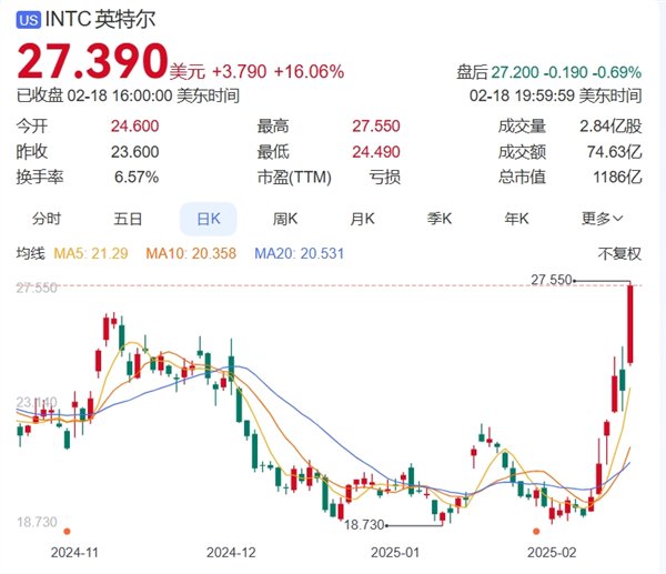 2月19日 信息,美东 工夫2月18日收盘,Intel股价大涨16.06%,报27.39美元,创2024年8月1日以来收盘新高,是自2020年3月以来涨幅最大的一天 。